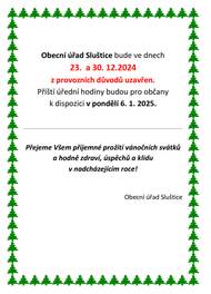 Obecní úřad Sluštice bude v týdnu od 29.12.2025 do 02. 01.2026 z provozních důvodů uzavřen. Příští úřední hodiny budou pro občany k dispozici v pondělí 5. 1. 2026