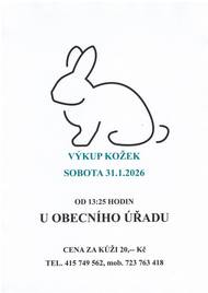 VÝKUP KOŽEK 31.1.2026. U OBECNÍHO ÚŘADU OD 13.25 HODIN. CENA ZA KŮŽI 20,00 KČ.