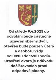 Od pondělí 6. října 2025 došlo k úpravě otevírací doby sběrného místa. Nově bude otevřeno od pondělí do pátku od 6:00 hodin do 18:00 hodin a o víkendech od 8:00 hodin do 18:00 hodin.