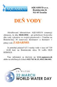 Akreditované laboratórium AQUASECO oznamuje občanom, že dňa 20.03.2026 – pri príležitosti Svetového dňa vody vykonáva vo svojich priestoroch v Trenčíne na Bratislavskej 36 stanovenie dusičnanov a dusitanov v pitnej vode ZADARMO.