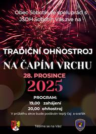 Obec Sobotín ve spolupráci s SDH Sobotín pořádají 25.prosince 2025 od 19:00 hodin "Tradiční ohňostroj na Čapím vrchu". V průběhu akce bude podáván teplý čaj a svařák.
