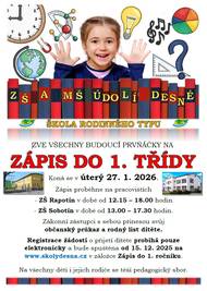 > v úterý 27. 1.2026 proběhne zápis do 1.třídy > ZŠ Rapotín v době od 12.15 - 18.00 hodin > ZŠ Sobotín v době od 13.00 - 17.30 hodin Registrace žádostí probíhá pouze elektronicky na www.skolydesna.cz v záložce Zápis do 1.ročníku