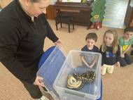 „Ve školce jsme měli chovatelku hadů, která nám přinesla několik těchto fascinujících zvířat. Proběhla ukázka, během které jsme se dozvěděli spoustu zajímavých informací o jejich životě , prostředí a chovu. Děti měly možnost se na hady podívat zblízka a dozvědět se, jak správně o ně pečovat.“