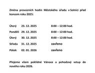 Informace o změně pracovních hodin na MěÚ Solnice v závěru roku 2025 a 2.1.2026.