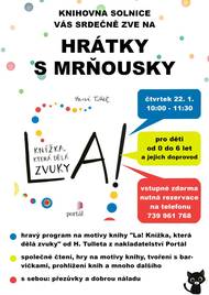 Srdečně vás zveme ve čtvrtek 22. ledna 2026 od 10 hodin do Městské knihovny v Solnici na hravý program na motivy knihy "La! Knížka která dělá zvuky" od H. Tulleta z nakladatelství Portál. Společné čtení, hry na motivy knihy, tvoření s barvičkami a mnoho dalšího. S sebou: přezůvky a dobrou náladu.