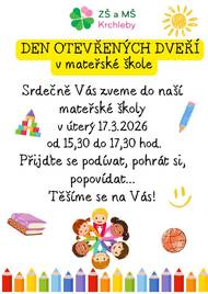 Mateřská škola Krchleby Vás zve na Den otevřených dveří, který se uskuteční v úterý 17. března 2026 od 15:30 do 17:30 hodin. a zápis do Mateřské školy Krchleby 24. března 2026 od 15. do 17. hodin.
