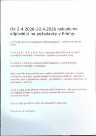 Česká pošta oznamujeme, že dojde k dočasné úpravě otevírací doby. V pátek 13. 3. 2026 bude otevřeno od 13:00 do 16:00 hodin. V období od 23. 3. do 27. 3. 2026 bude otevírací doba následující: Pondělí: 8:00–12:00 Úterý: 13:00–16:00 Středa: 8:00–12:00 Čtvrtek: 13:00–16:00 Pátek: 13:00–16:00