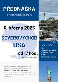 Městská knihovna zve na přednášku 6. března od 17 hodin Martina Štěpána o Nové Anglii, New Yorku, Kukuřičném pásu, Oblasti Velkých jezer, Rezavém pásu a otázce, která nad touto zemí visí...Potřebuje se Amerika udělat opět velkou? Těšíme se na Vás :D