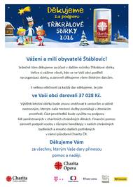 Vážení a milí obyvatelé Štáblovic! Srdečně Vám děkujeme za účast v dalším ročníku Tříkrálové sbírky. Velice si vážíme všech, kdo se v naší obci podíleli na organizaci sbírky, a zároveň děkujeme všem štědrým dárcům. S velkou vděčností za každý dar sdělujeme, že jste ve Vaší obci darovali 37 028 Kč. Výtěžek letošní sbírky bude znovu směřovat k seniorům a vážně nemocným, kterým naše terénní služby pomáhají v domácím prostředí. Část prostředků bude využita na podporu lidí zaměstnaných v charitních chráněných dílnách. Finanční pomoc zároveň podpoří osoby s různými hendikepy v našich chráněných bydleních a mnoho dalších potřebných v rámci působení Charity ČR. Děkujeme Vám za všechny, kterým Vaše dary přinesou pomoc a naději.