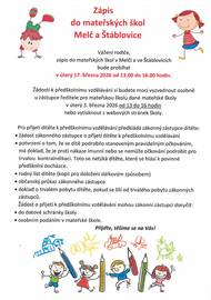 Vážení rodiče, zápis do mateřských škol v Melči a ve Štáblovicích bude probíhat v úterý 17. března 2026 od 13.00 do 16.00 hodin. Žádosti k předškolnímu vzdělávání si budete moci vyzvednout osobně u zástupce ředitele pro mateřskou školu dané mateřské školy v úterý 3. března 2026 od 13 do 16 hodin nebo vytisknout z webových stránek školy.