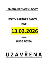 Pošta Partner Šafov bude v pondělí 26.1.2026 otevřena pouze od 8:00 do 10:00 hodin.Odpoledne zavřeno