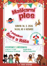 T.J. Sokol Košatka zve na Maškarní ples s pohádkou Čert a Káča v sobotu 14. 3. 2026 od 14:00 v KD Košatka. Prodej vstupenek s místenkou od 1. 3. 2026 u p. Jiřího Chmelíčka, 774 405 808. Vstupné: dospělí 100 kč, děti bez masky 50 Kč.
