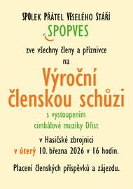 SPOlek Přátel VEselého Stáří SPOPVES zve všechny členy a příznivce na Výroční členskou schůzi s vystoupením cimbálové muziky DŘIST, která se bude konat v úterý 10. 3. 2026 v 16 hodin v hasičské zbrojnici. Na programu bude mimo jiné i placení členských příspěvků a zájezdu.