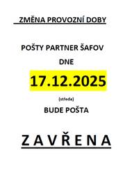 Dne 26.01.2026 bude pošta Partner Šafov otevřena pouze dopoledne od 8:00 do 10:00. Odpoledne bude pošta zavřená.