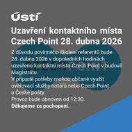 Z důvodu povinného školení referentů bude 28. dubna 2026 v dopoledních hodinách uzavřeno kontaktní místo Czech Point v budově Magistrátu. V případě potřeby mohou občané využít ověřovací služby notářů nebo Czech Point u České pošty. Provoz bude obnoven od 12:30. Děkujeme za pochopení.