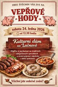 Srdečně Vás zveme na Vepřové hody v sobotu dne 24.1.2026, začátek od 12:30 hod v KD na Lačnově. Přijďte si pochutnat na tradičních zabijačkových specialitách.Všichni jste srdečně zváni.