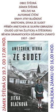 zámek Štědrá sobota 19.7. od 17,00 hod., autorské čtení J.Blažkové z knihy ANETCHEN,DÍVKA ZE SUDET. Silný obraz osudů lidi v okolí Štědré a Žlutic během dramatických dějinných zvratů 1937-1947.