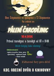 Obec Štěpánovice ve spolupráci s TJ Štěpánovice zve všechny občany na tradiční Pálení čarodějnic, které se uskuteční 30. dubna 2025 na obecním dvoře u knihovny. Veškeré informace na přiloženém plakátu.