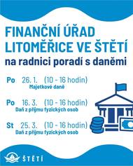 Město Štětí pořádá v sobotu 24. 1. Zájezd za sněhem na Tanvaldský Špičák. Odjezd v 6 hodin z Mírového náměstí, návrat zhruba kolem 18 hodiny. Cena zájezdu 100 korun za osobu. Přihlášky a platby v Informačním centru města Štětí. Finanční úřad Litoměřice poradí ve Štět s daňovým přiznáním. Pracovníci finančního úřadu budou ve Štětí na Městském úřadu k dispozici v pondělí 26. 1. od 10 do 16 hodin. V tento termín poradí s majetkovými daněmi.