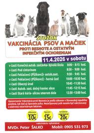 Dňa 11.04.2026 v sobotu sa bude konať v našej obci vakcinácia psov a mačiek.