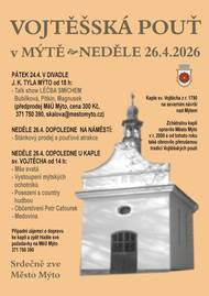 Vojtěšská pouť se uskuteční v pátek 24. dubna a neděli 26. dubna 2026 v Mýtě. V pátek od 18 hodin proběhne talk show LÉČBA SMÍCHEM v divadle J.K. Tyla. V neděli se můžete těšit na stánkový prodej a atrakce na náměstí, následované mší svatou u kaple sv. Vojtěcha a vystoupením mýtských ochotníků.