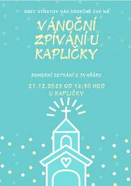 Vánoční zpívání u kapličky. Již tradiční akce se koná v neděli 21.12. od 16,30 hodin. Přijďte na komorní akci, podebatovat se sousedy, zazpívat si nějaké vánoční písně či koledy a dát si nějaký teplý nápoj.