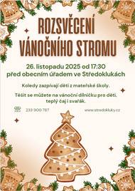 Obec Středokluky zve na akci "Rozsvěcení vánočního stromku" 26. listopadu 2025 od 17.30 před OÚ Středokluky. Koledy zazpívají děti z mateřské školy. Těšit se můžete na vánoční dílničku pro děti, teplý čaj i svařák.