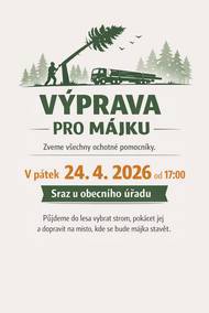 🎋 VÝPRAVA PRO MÁJKU Zveme všechny ochotné pomocníky. 📅 V pátek 24. 4. 2026 od 17:00 📍 Sraz u obecního úřadu Střelice Půjdeme do lesa vybrat strom, pokácet jej a dopravit na místo stavění májky.