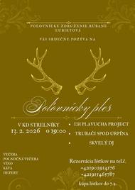 Poľovnícke združenie Rúbane Ľubietová Vás srdečne pozýva na POĽOVNÍCKY PLES, dňa 13. 2. 2026 o 19:00 hod. do Kultúrneho domu v Strelníkoch.