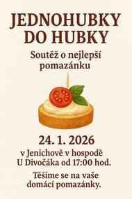 Před 5 dnySoutěž o nejlepší pomazánkuSrdečně vás zveme na příjemnou a chutnou akci Jednohubky do hubky, která se bude konat 24. ledna od 17:00 hodin v hospodě U Divočáka. Součástí večera bude soutěž o nejlepší domácí pomazánku, do které se může zapojit opravdu každý, kdo má chuť se pochlubit svým kulinářským uměním, nebo jen rád ochutnává. Čeká vás pohodová atmosféra, spousta dobrého jídla, přátelské setkání a zábava 🙂. Přijďte si užít společný večer a podělit se o své oblíbené chutě. Těšíme se 🌼.