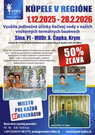 Kúpele Trenčianske Teplice ponúkajú pre občanov, ktorí majú trvalý pobyt v našej obci zľavu vo výške 50% na vstup do termálnych bazénov Sina, PI - MUDr. A. Čapka a Krym v Trenčianskych Tepliciach, v termíne od 1.12.2025 do 28.2.2026.