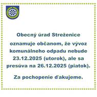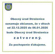 Obecný úrad Streženice oznamuje občanom, že v dňoch od 22.12.2025 do 6.1.2026 bude Obecný úrad zatvorený. Za pochopenie ďakujeme.