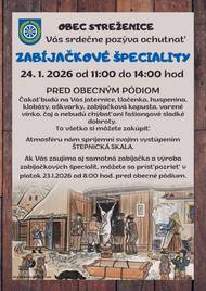 Obec Streženice vás pozýva na ochutnávku zabíjačkových špecialít, ktorá sa uskutoční 24. januára 2026 od 11:00 na detskom betónovom ihrisku. Tešiť sa môžete na jaternice, tlačenku, klobásy a ďalšie dobroty. Atmosféru spríjemní vystúpenie skupiny Štepnická skala.