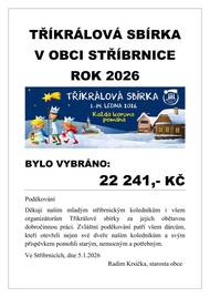 Děkuji našim mladým stříbrnickým koledníkům i všem organizátorům Tříkrálové sbírky za jejich obětavou dobročinnou práci. Zvláštní poděkování patří všem dárcům, kteří otevřeli nejen své dveře našim koledníkům a svým příspěvkem pomohli starým, nemocným a potřebným. BYLO VYBRÁNO: 22 241,- KČ