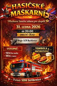 Sbor dobrovolných hasičů Stříbrnice Vás srdečně zve na HASIČSKÉ MAŠKARNÍ, které se uskuteční v sobotu 31.1.2026 od 20:00 hod. v sále OÚ. Připravena je bohatá tombola, občerstvení zajištěno. K poslechu a tanci hraje LCR Buchlovice. Vstupné 150 Kč bez masky, s maskou 100,- Kč.