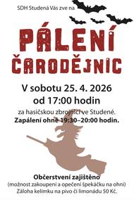 SDH Studená Vás zve na pálení čarodějnic v sobotu 25.4.2026 od 17:00 hodin za hasičskou zbrojnicí ve Studené. Zapálení ohně od 19:30 - 20:00 hodin. Občerstvení zajištěno, možnost zakoupení a opečení špekáčku na ohni. Záloha na kelímek 50 Kč