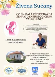 Ženský spolok Živena Sučany pozýva na odbornú prednášku a diskusiu s gynekologičkou MUDr. Zuzanou Ondák Laučekovou, PhD. Podujatie je zamerané na búranie mýtov o gynekologickom vyšetrení a zdôraznenie dôležitosti prevencie.