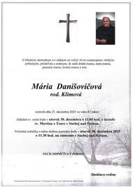 Oznamujeme, že dňa 25.12.2025 vo veku 87 rokov zomrela Mária Danišovičová rodená Klimová. Zádušná sv. omša za zosnulú bude dňa 30.12.2025 o 11:00 hod. vo farskom kostole v Suchej nad Parnou a po nej bude posledná rozlúčka so zosnulou na miestnom cintoríne o 11:30 hod.