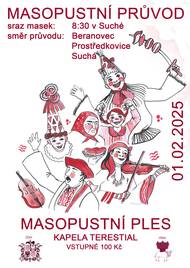 Sucha: Vazeni spoluobcane, v sobotu 1.2.2025 probehne masopustni pruvod a nasledne maskarni zabava s bohatou tombolou. Zajemci do masopustniho pruvodu jsou velmi vitani. Vice na www.obecsucha.cz nebo na digitalni uredni desce. S pozdravem TC