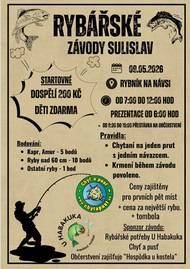 Srdečně zveme všechny na rybářské závody, které se budou konat dne 17. 5. 2025 (7:00 - 12:00 hod.) u rybníka "Na vršku" pod kostelem v Sulislavi. Své automobily prosím zaparkujte na návsi, děkujeme. Prezence: od 6:00 hod. Startovné: dospělí 200 Kč, děti do 15 let zdarma S sebou: jeden prut s jedním návazcem, kýbl a vezírek Ceny věnují Rybářské potřeby U Habakuka. Po skončení závodů proběhne tombola. Občerstvení zajištěno.