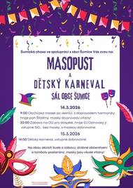 Vážení občané, Šumická chasa ve spolupráci s obcí Šumice vás srdečně zve na Masopust a dětský karneval, který se uskuteční o víkendu 14. a 15. března 2026 v sále obce Šumice. V sobotu 14. března v 9 hodin ráno proběhne obchůzka masek po vesnici za doprovodu harmoniky, hrát bude pan Šťastný. Masky jsou do průvodu vítány. Ve stejný den večer, od 20 hodin, se uskuteční zábava pro dospělé na OÚ, hraje DJ Ostrovský junior. Vstupné je 150 korun, bez masky, s maskou dobrovolné. V neděli 15. března od 14 hodin se můžete těšit na dětský karneval, vstupné je dobrovolné. Na obou akcích bude zajištěna zábava, drobné občerstvení i tombola. Masky jsou všude vítány. Těšíme se na vaši účast!