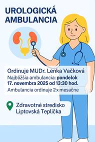 Urologická ambulancia MUDr. Lenky Vačkovej v zdravotnom stredisku v Liptovskej Tepličke prijíma nových pacientov a poskytuje odborné urologické vyšetrenia bez dlhého čakania.