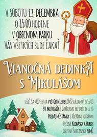 V sobotu 13. decembra o 15:00 hod. sa stretneme v obecnom parku, kde nás privíta Mikuláš a príjemná predvianočná atmosféra. Program: • vystúpenie detí MŠ Šurianky o 16:00 • príchod sv. Mikuláša s balíčkami pre deti o 16:30 • predajné stánky a drobné vianočné darčeky Občerstvenie: pečené klobásky a hurky a tradičný šuriansky punč. Príďte si užiť pokojné popoludnie v parku, stretnúť sa s ostatnými a naladiť sa na Vianoce. Tešíme sa na vás!