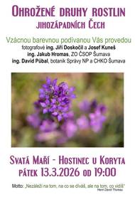 Přijďte na přednášku zaměřenou na ohrožené druhy rostlin jihozápadních Čech. V pátek 13. března 2026 od 19:00 v hostinci U Koryta ve Svaté Maří. Můžete se těšit na výklad a fotografie od odborníků z oblasti botaniky a ochrany přírody.