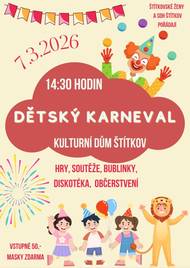 Dětský karneval se uskuteční v kulturním domě ve Štítkově dne 7.3.2026. Přijďte si užít odpoledne plné her, soutěží a zábavy. Vstup na akci je 50,- Kč, masky zdarma.