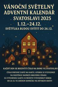 Od 1. prosince se každý den v okně jednoho z domu ve Svatoslavi objeví číslo. Čísla se budou objevovat postupně až do 24. prosince. Hrací kartičku s informacemi si vyzvednete na nástěnce naproti OÚ. Čísla budou svítit každý den od 16.00 do 20:00 až do 26. 12.
