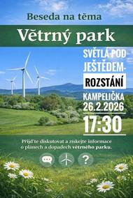 Zveme vás na besedu věnovanou tématu větrného parku. Přijďte diskutovat a získat více informací o plánovaných záměrech, možných dopadech a přínosech větrného parku pro obec i okolí. 📅 Kdy: čtvrtek 26. 2. 2026 od 17:30 hodin 📍 Kde: Kampelička, Rozstání čp. 1