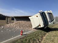Převrácený kamion se štěrkem zablokoval silnici u Svídnice, řidič vyvázl bez zranění