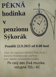 Přijďte na Pěknou hodinku v Sýkoráku, která se uskuteční v pondělí 22. září 2025 od 8:00 hodin. Na návštěvníky čeká vypečená kachnička, řízek s domácím bramborovým salátem a další dobroty. Po celý den bude hrát živá muzika.