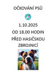 Dne 1. října 2025 se uskuteční očkování psů, které proběhne před hasičskou zbrojnicí. Akce začíná v 18.00 hodin. Vyzýváme majitele psů, aby přivedli své mazlíčky a nezapomněli na očkovací průkazy.